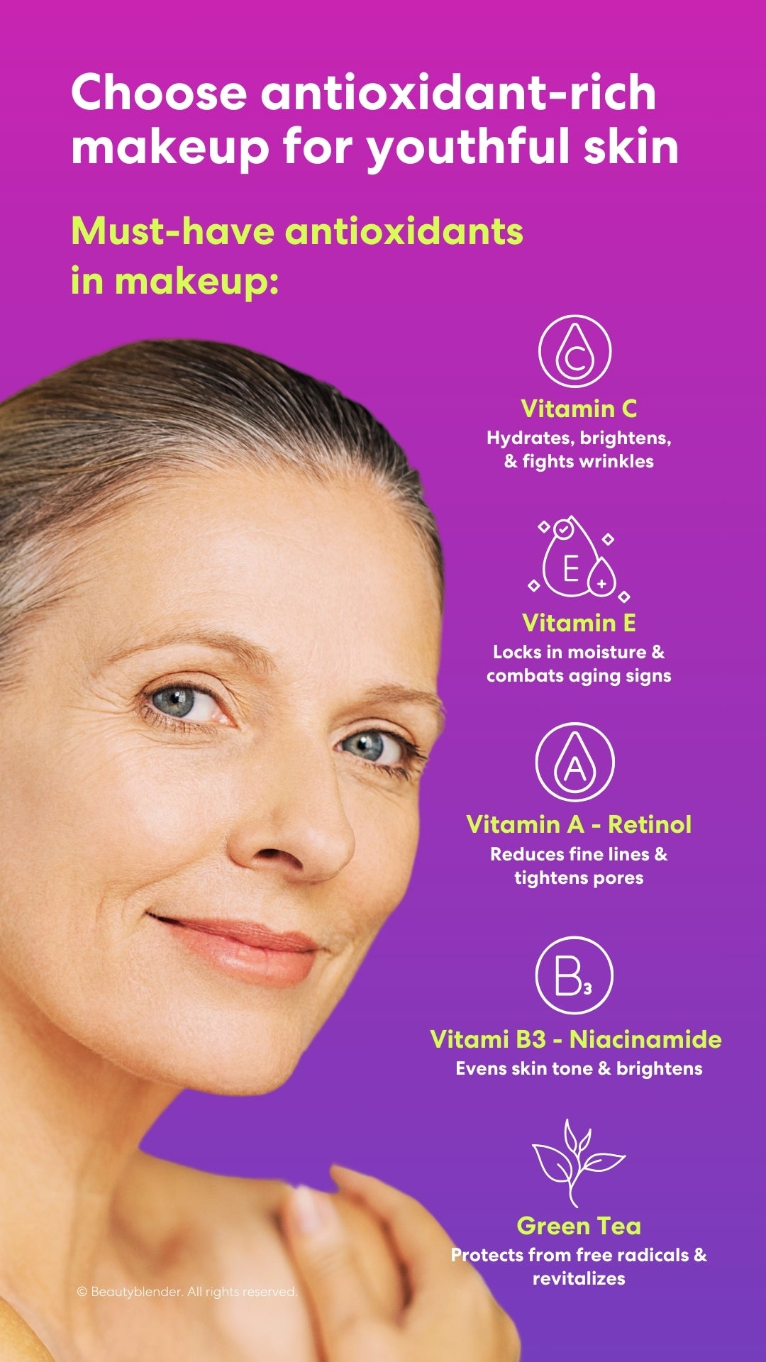 Antioxidants are substances that protect the skin from ultraviolet (UV) damage and environmental pollution. When shopping for makeup products for aging skin, look for formulas with the following antioxidants: