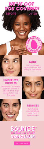 Not to brag or anything, but BOUNCE Airbrush Liquid Whip Concealer happens to have both. Plus, it comes in a sleek package with a wand applicator that’s perfect for treating just the spots you need covered or camouflaged. Just dab, wait a couple seconds to let BOUNCE take hold of skin, and then use your finger or sponge to blend it in.